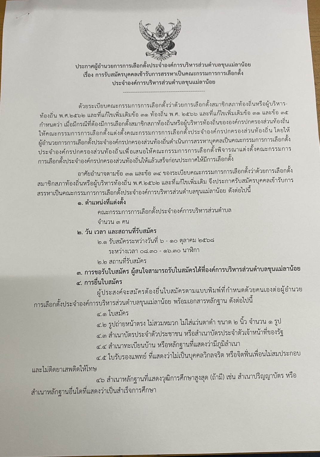 ประกาศ : อบต.เปิดรับสมัครบุคคลเข้ารับการสรรหาเป็นคณะกรรมการการเลือกตั้งประจำองค์การบริหารส่วนตำบลขุนแม่ลาน้อย ท่านใดประสงค์จะสมัคร ยื่นใบสมัครได้ที่ผู้อำนวยการการเลือกตั้งประจำองค์การบริหารตำบลขุนแม่ลาน้อย 6-10 ต.ค.68 คะ